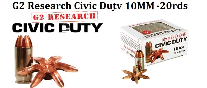G2 Research Civic Duty Ammunition features a similar design to the world famous G2 Research R.I.P. Ammunition but with a heavier bullet, built to not break apart. The Civic Duty has a similar 100% copper petaled-trocar bullet that expands to more than 2.5 times its initial diameter upon entering fluid. During expansion, the trocars peel back increasing the size of the wound channel. The open trocars hold together around the base of the projectile and transfer all of the bullet's energy into the target. The Civic Duty's solid copper design also ensures total weight retention in fluid.