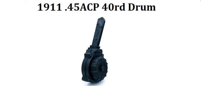 This 40-rd drum is for the 1911 style firearms chambered in .45 ACP. The magazine body is constructed of a proprietary DuPont Zytel based polymer to ensure a long service life. All components proudly made in the U.S.A.
