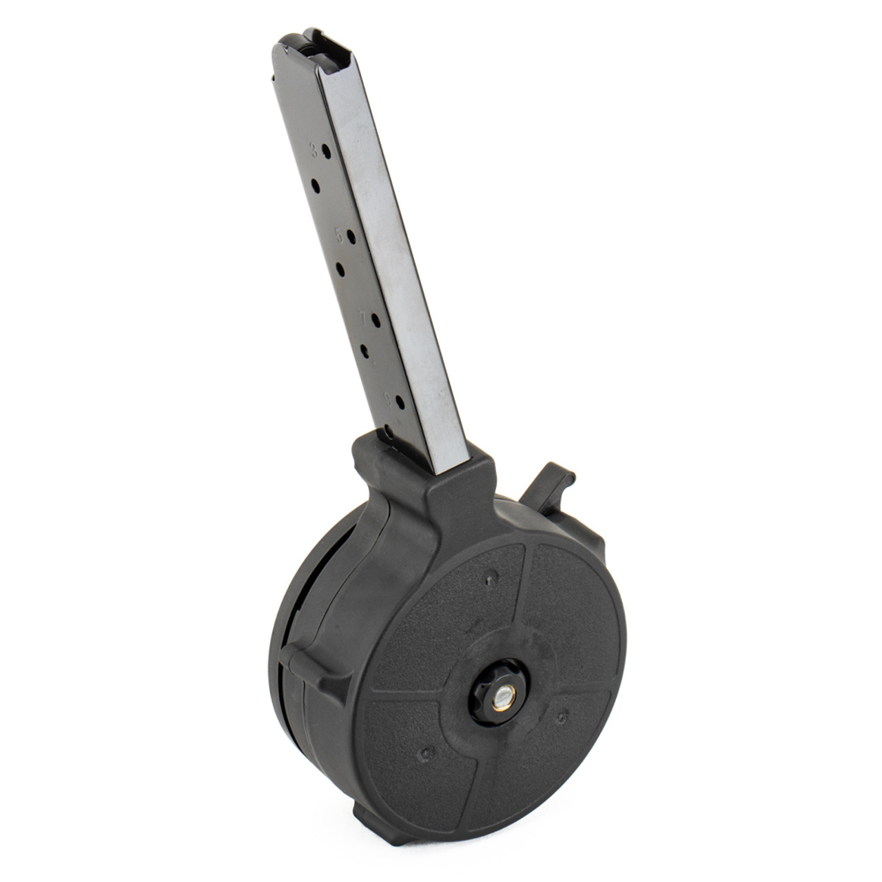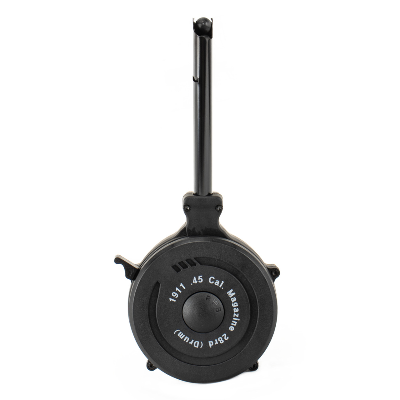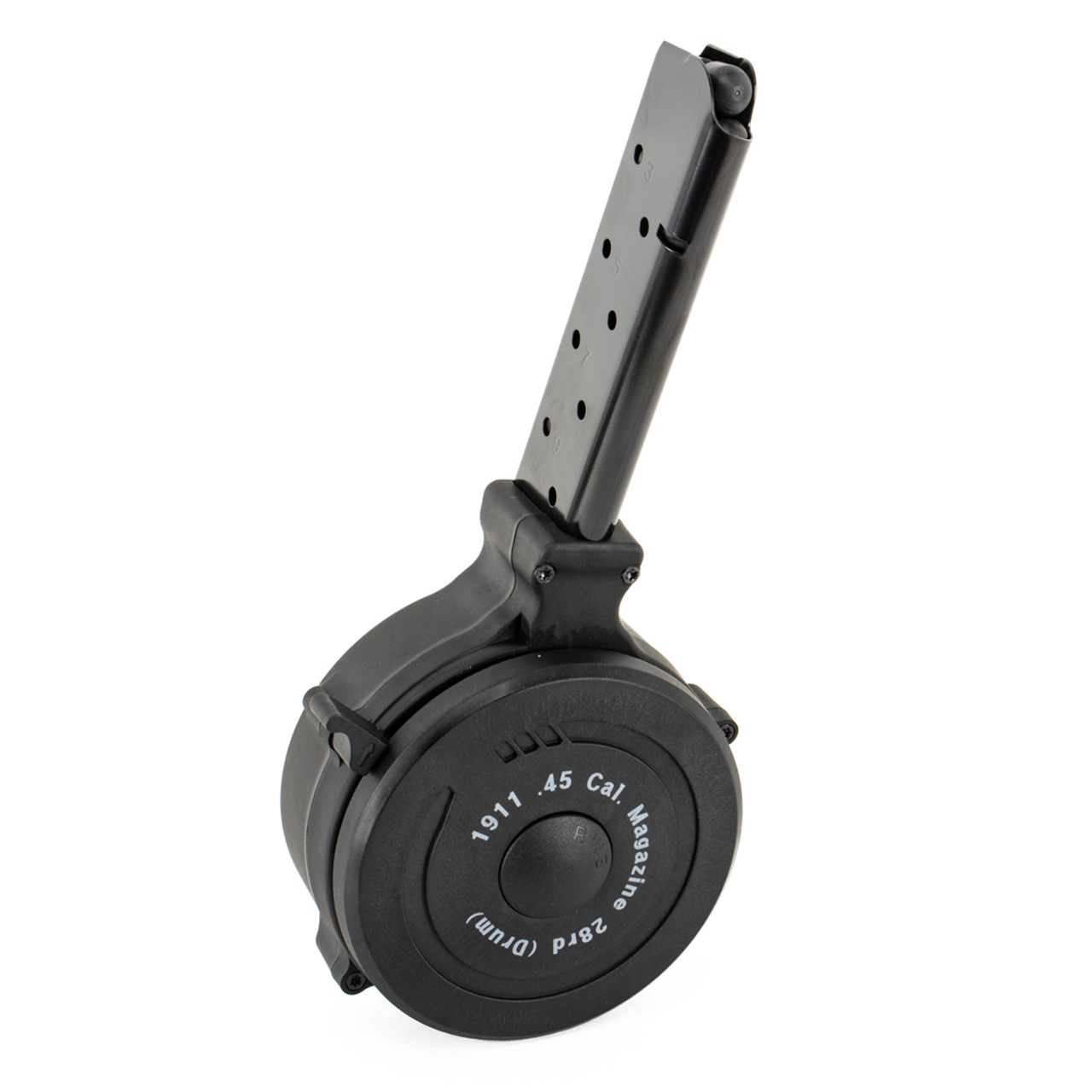 Korean Manufacturer KCI has come up with the ultimate high-capacity magazine for your 1911 style 45ACP. Heavy duty, polymer drum magazine is easy to load with integral spring tension releasing cam. Simply move the cam, drop in a round and repeat until magazine is full of 28 rounds of 45ACP ammunition. Works in 1911 style 45 ACP pistols.
