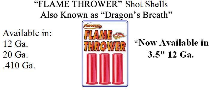 The "Dragon's Breath" round produces an enormous wall of fire for 200 plus yards. The incendiary metal compound contained inside burns when fired at over 5000 degrees, showering your target in a momentary wall of flame. Our ammunition is loaded in a licensed professional facility using the finest components. It is the highest quality and most effective round of its type made. While it is extremely fun to shoot, it is also an effective deterrent.