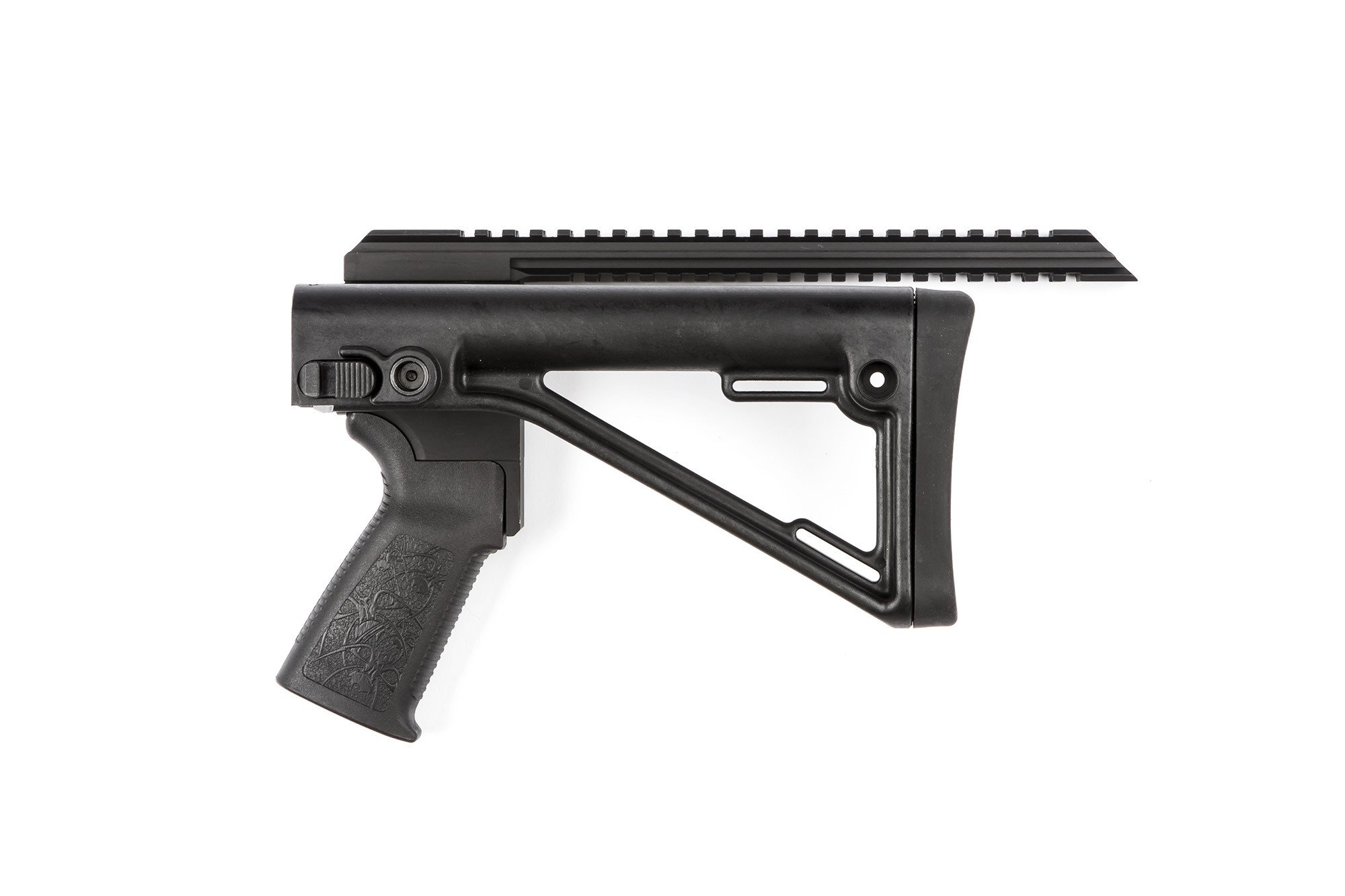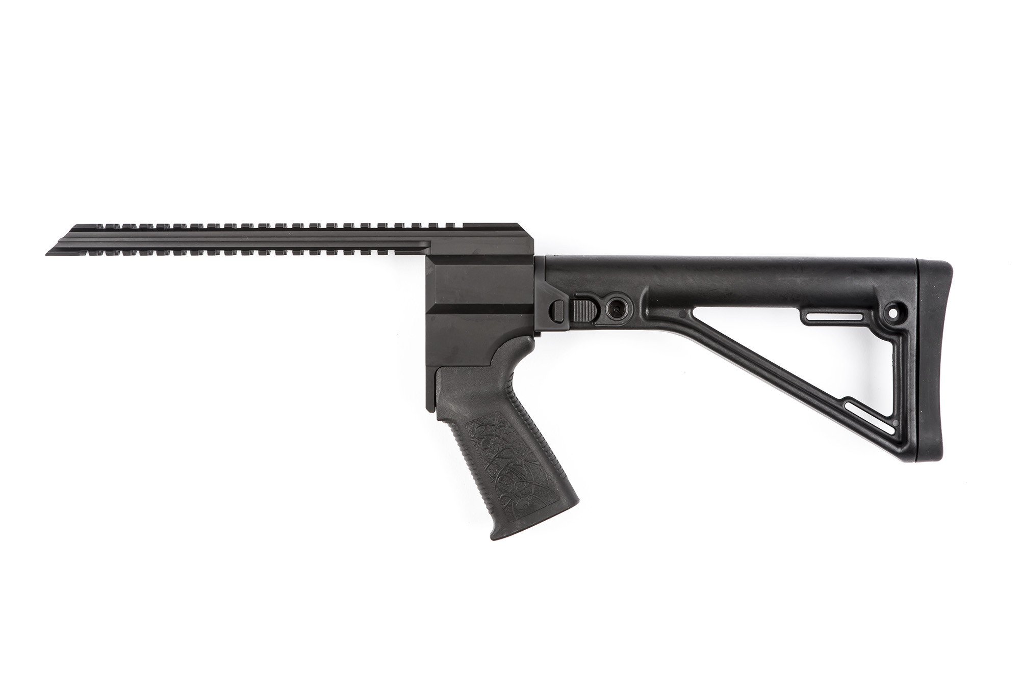 The Side-Folding model features an AGP folding stock and is compatible with most aftermarket AR-15 pistol grips.