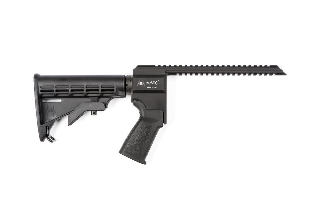 The Kaos Stock System series allows you to take your existing rail mounted Havoc launcher and turn it into a stand-alone weapon system. It is compatible with most aftermarket AR15 stocks, latch plates, & pistol grips. Designed for durability and versatility, the Kaos Stock System features a rigid aluminum chassis that delivers a solid, balanced feel without unnecessary weight. Its extended top rail provides ample space for optics and accessories, making it ideal for custom builds and specialized configurations. Whether upgrading an existing setup or completing a new project, the Kaos Stock System offers a streamlined, professional-grade solution built for reliability and performance. This stock is designed for the Havoc 9" launcher.