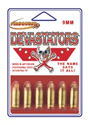It's Awesome! It's Powerful! It's the Ultimate in Self-Defense ammo! Devastator ammunition is designed to produce one shot stops and eliminate the dangers of pass through shots. Its devastating knockdown power comes from the hollow point cavity in each round being filled with a special "Detano-Expanding" compound. Devastator ammo grossly expands on impact to insure 100% maximum energy is delivered to the target and reduces the chance of a pass through. This makes Devastator with Detonating Tips the ultimate ammo for home defense, personal protection and law enforcement applications. Six rounds per pack.