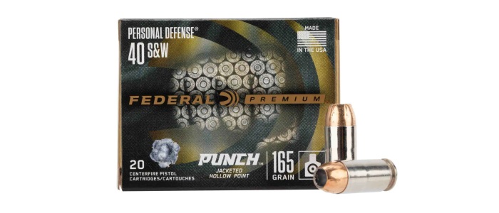 The Federal Personal Defense Punch .40 S&W 165Gr is a reliable round for self-defense These rounds offer a 165 grain Jacketed Hollow Point (JHP) with a lead core. These .40 S&W cartridges boast a brass casing for optimal accuracy and reliability. The Federal .40 S&W cartridge boasts non-magnetic lead core, non-corrosive boxer primer and brand new virgin brass casing that can be reloaded for those high volume .40 caliber shooters that love to reload their ammunition.