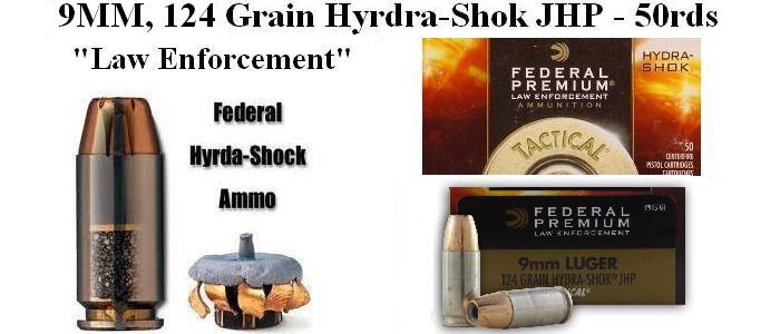 Federal is currently making the Hydra-Shok bullet as the newest technology in bullet design with increased penetration and upset (mushrooming). Perfect ammunition for Personal Protection at an inexpensive price. Legal to own by individuals, but very limited quantities. The choice of law enforcement agencies nationwide. Federal's unique center-post design delivers controlled expansion, and the notched jacket provides efficient energy transfer to penetrate barriers while retaining stopping power. The deep penetration of this jacketed bullet satisfies even the FBI's stringent testing requirements.