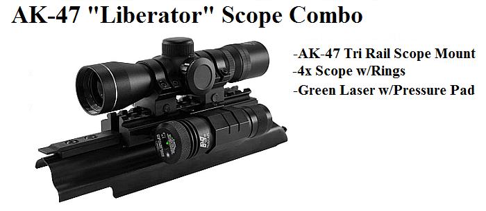 Are you ready to run n gun? The NCStar Liberator Combo AK47 Tactical Package. comes with a fixed illuminated scope and green laser for all of your sighting needs. Includes a replacement dust cover with tri-rail weaver style mount. The Liberator Combo comes complete with a Tactical 4x30 Compact Scope, 1” Weaver Style Rings, AK Tri-Rail Mount, and Green Laser w/ Mount and Pressure Switch.