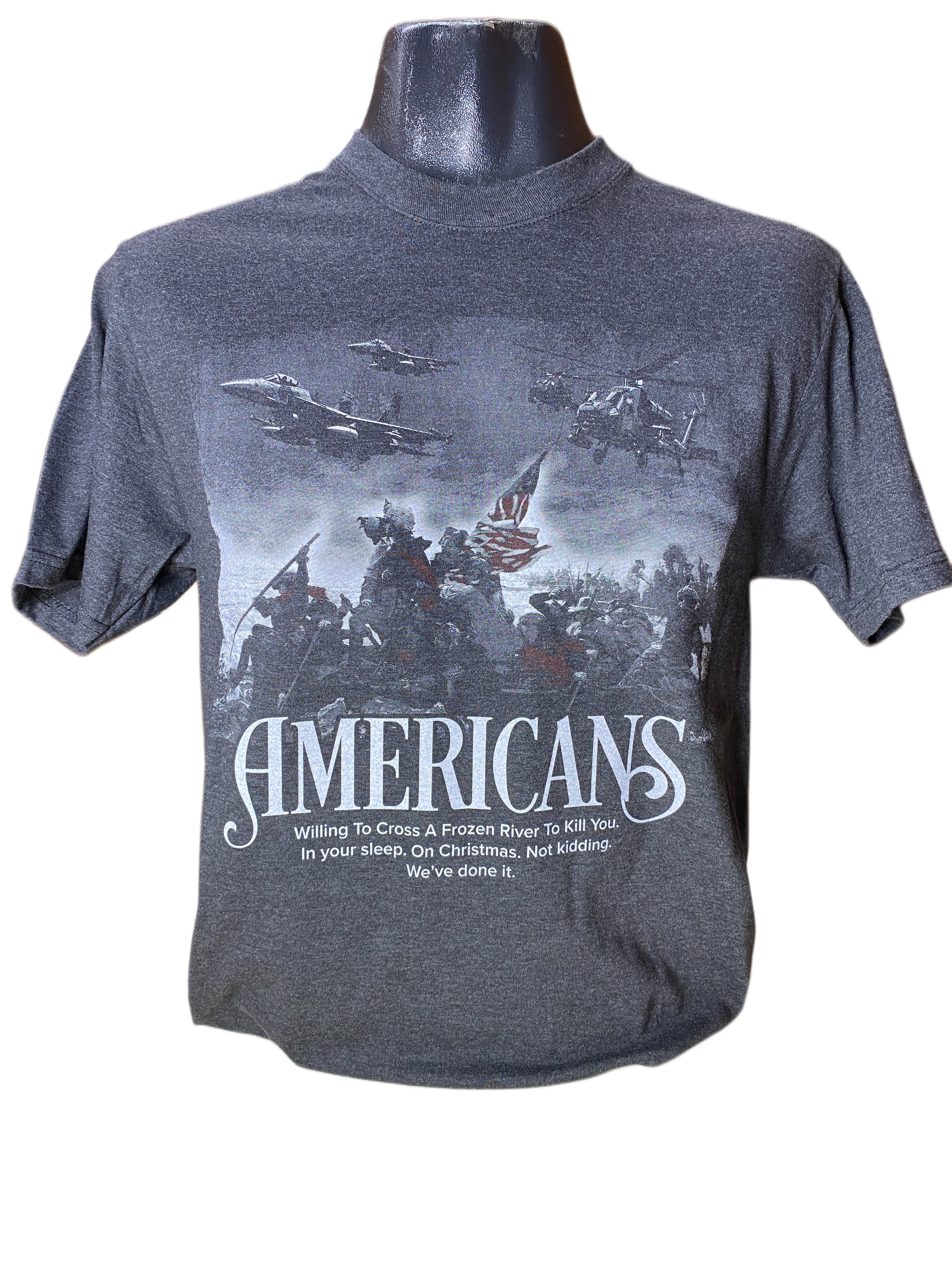 Americans...Willing to cross a frozen river to kill you. In your sleep. On Christmas. Not Kidding. We've done it. Comes sized in S-3XL, Color: Dark Gray