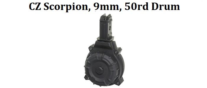 This 50-rd drum is for the CZ Scorpion firearms chambered in 9mm. The magazine body is constructed of a proprietary DuPont Zytel based polymer to ensure a long service life. All components proudly made in the U.S.A.