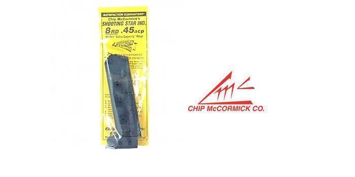 Chip McCormick Match Grade M1911 Style, 45 ACP, 8 round black With Long Base Pad. This is the same design CMC supplies to America's top 1911 manufacturers for use as factory standard in their pistols. Tolerances are 50% tighter than military specification mags and has the same length as stock magazines. These heavy duty mags deliver extra capacity and improved performance.