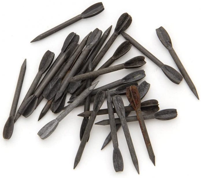 A Flechette is a small dart shaped projectile, that is clustered in an explosive warhead, dropped in a missile from an airplane or fired from a hand held weapon. One unique application of this 1" Flechette was to load these in a 12 GA. shotgun for taking out snipers hiding in thick brush or trees. Due to the penetration of these projectiles, tree limbs and brush would not disperse the darts. Even if some were dispersed, this would still have an all-covering pattern within a tree or brush. Generally 20 of these darts are placed in each 12 GA. shell. Also known as "Satan's Toothpicks" 2 3/4" round.