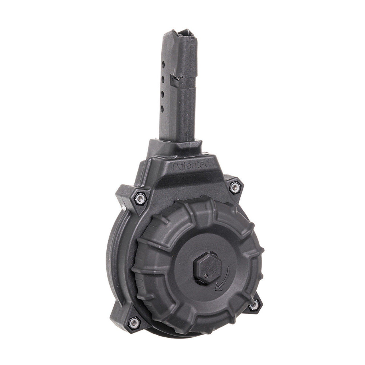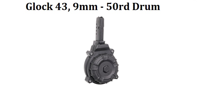 This 50-rd drum is for the Glock 43 firearms chambered in 9mm. The magazine body is constructed of a proprietary DuPont Zytel based polymer to ensure a long service life. All components proudly made in the U.S.A.