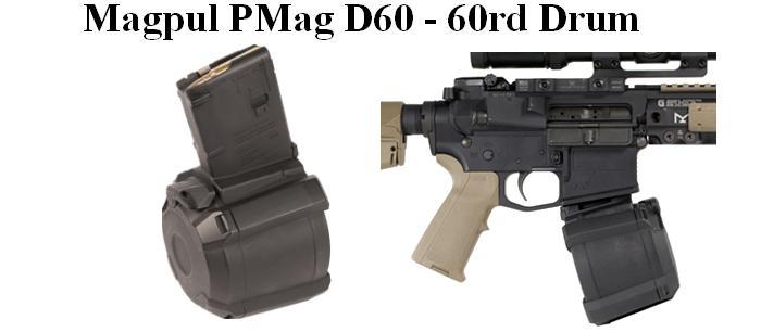 The PMAG D-60 is a durable, lightweight, highly reliable 60-round 5.56x45 NATO/.223 Remington* polymer drum magazine for AR15/M4 compatible weapons.