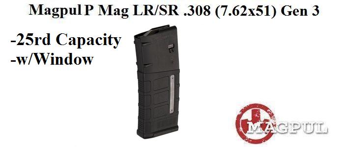 The 7.62x51 NATO (.308 Winchester) PMAG 25 LR/SR GEN M3 Window is a lightweight, cost effective, high reliability magazine for SR25/M110 pattern rifles featuring true 25-round capacity, constant-curve body, anti-tilt follower, snap on Impact/Dust Cover, and features transparent windows to allow rapid visual identification of approximate number of rounds remaining.