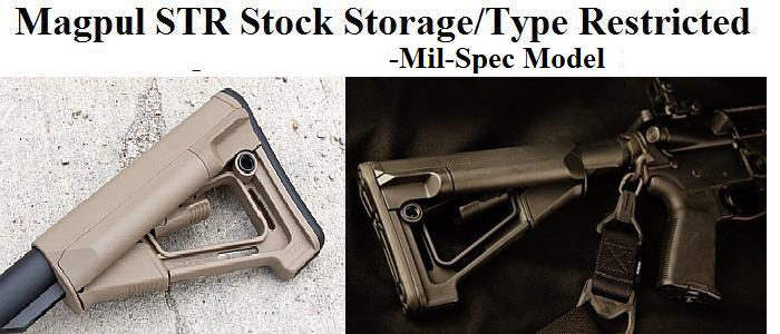 The Magpul STR (Storage/Type Restricted) is a drop-in replacement buttstock for AR15/M16 carbines using mil-spec sized receiver extension tubes. A storage-capable version of the CTR, the STR has improved cheek weld and two water resistant battery tubes on a compact, reinforced polymer A-frame design.