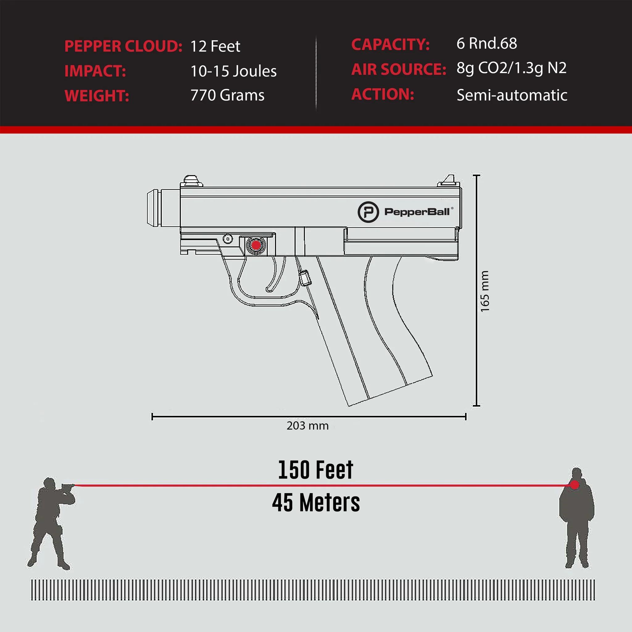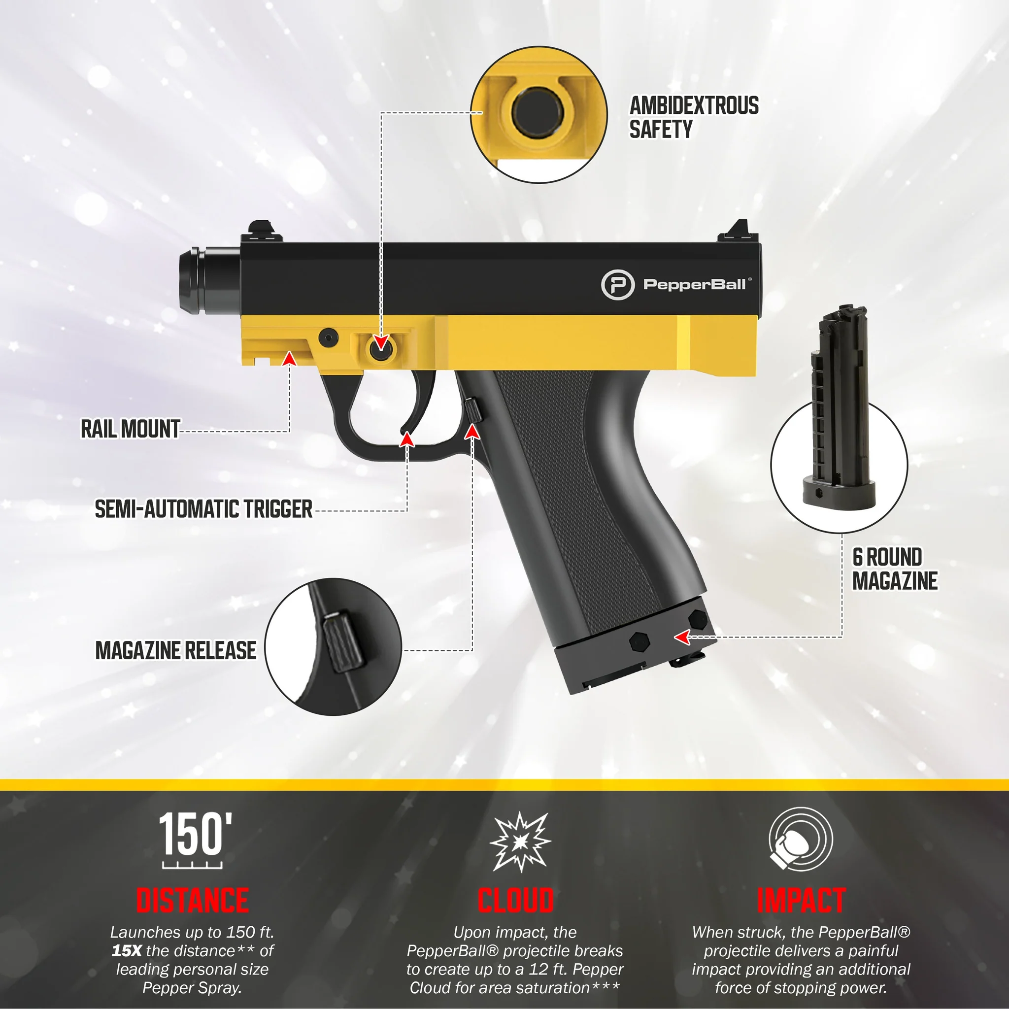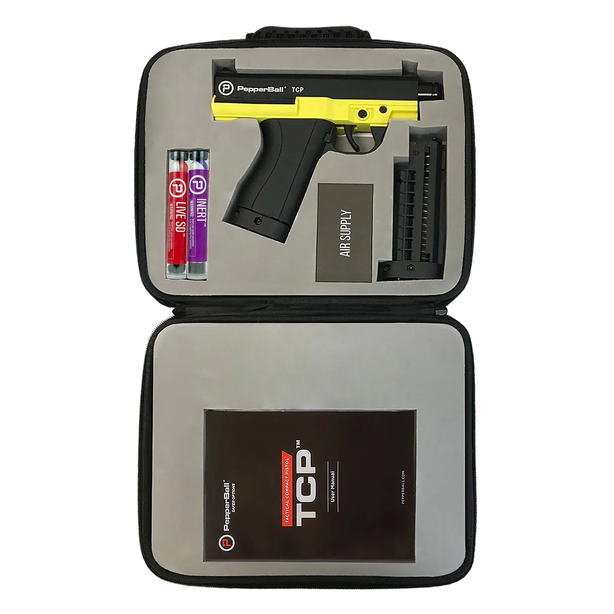 The TCP™ (Tactical Compact Pistol) is a PepperBall launcher that gives you the ability to have a multi-shot, non-lethal product on your belt, in your car, home, or when you travel. Requires no license or waiting period.