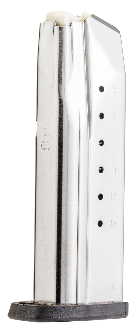These 16-round factory replacement magazines feature durable stainless-steel construction (polished to a high natural shine) with flat polymer baseplates and at-a-glance witness holes for keeping track of ammunition. Polymer Glock design and simplicity meet classic 1911 style and All-American construction with the Smith & Wesson SD9/SD9VE magazine.