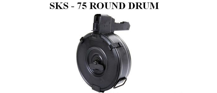 For the ultimate in capacity for an SKS, this 75-round drum can't be surpassed. Made on original tooling, The crank design permits the magazine to be stored loaded with no spring tension (meaning no fatigue) and then cranked when ready to be used. The 2-piece clam shell body allows for ease of loading and maintenance. 7.62x39 cal.