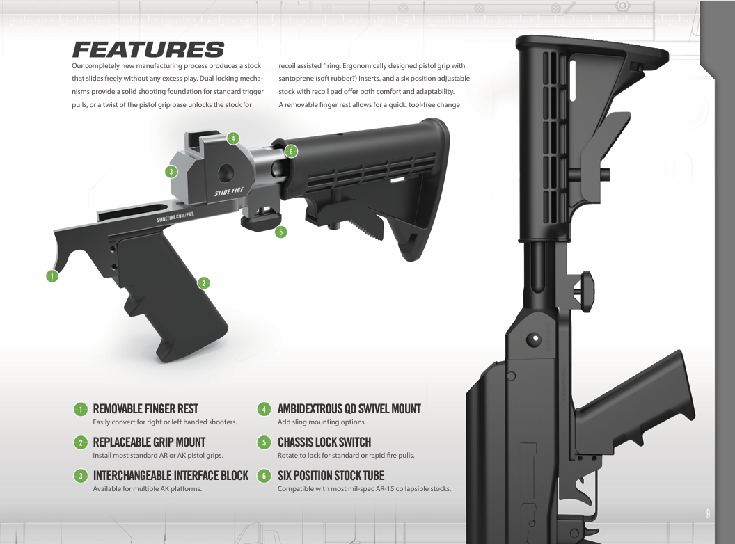 It’s here! Get your AK bumping with the Slide Fire SSAK-47 HYB. The SSAK-47 HYB is equipped with the standard AR butt stock and pistol grip and is fully customizable with all your favorite furniture brands! That’s right, a bump stock with the bumpfire tech in the chassis. The reversible finger rest allows for use by both left and right-handed shooters. The new chassis system is aircraft grade aluminum; precision machined in order to maintain a smooth sliding action while minimizing excess play. The SSAK-47 HYB utilizes an interface block featuring ambidextrous QD swivel mount.