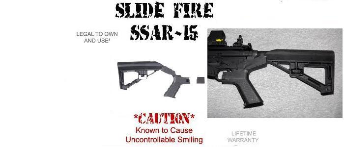 100% legal to own and use! Slide Fire Solutions' ground breaking "Slide Stock" technology and ergonomic design provide individuals the ability to Bump Fire more safely - offering another element of entertainment for recreational shooters everywhere! You can now safely and accurately bump-fire your AR-15 at an incredible rate. Each SSAR-15 comes with an Interface Block, SSAR-15 Rifle Stock, and Installation / Operation Instructions.
