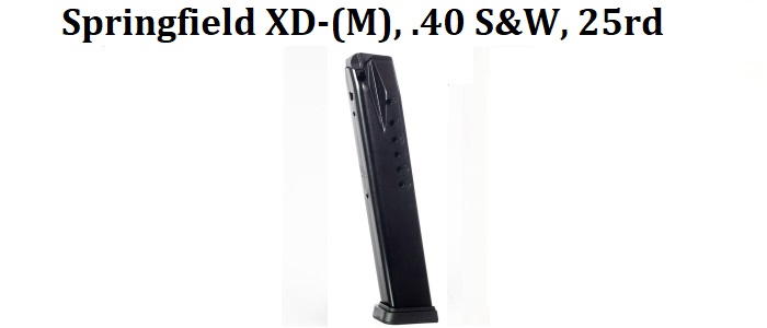 This Magazine is an extended blue-steel magazine holding 25rds of .40 S&W ammunition for the Springfield XD-M.