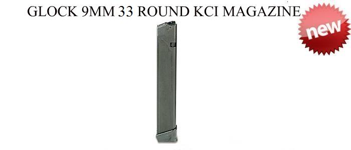 KCI 33 Round Magazine will fit any Glock 9MM. Capacity is 33 rounds.