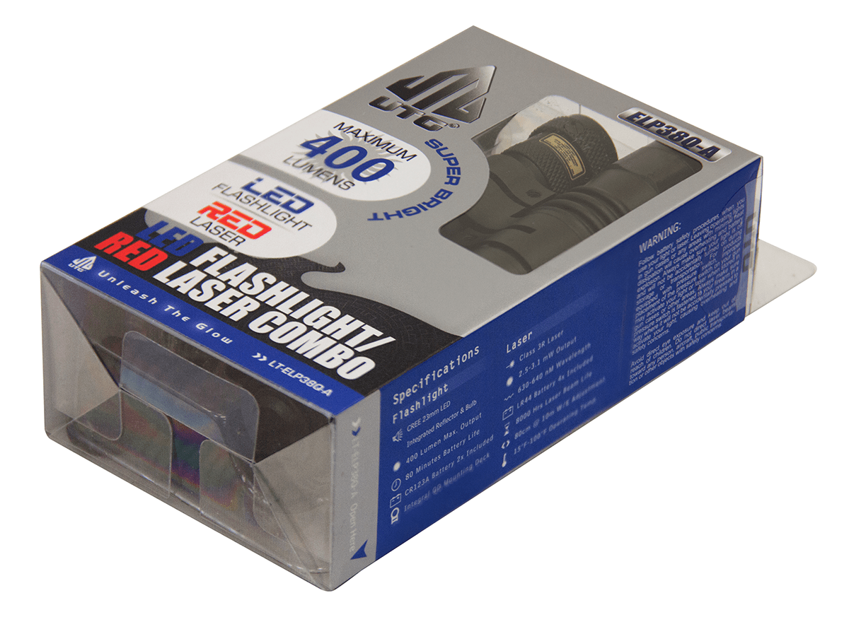 This two-in-one tactical LED 400 lumen flashlight and laser light combination from UTG provides instant spot focus for clear downrange object identification. A 16-position adjustable, removable, TS-rated precision red laser enables rapid target acquisition. The flashlight has a tail push-button momentary switch and end cap twist-on switch, while the laser has an ambidextrous push-button switch. An integrated clamp-on mounting deck fits most tactical pistols and firearms with or without rail slots.