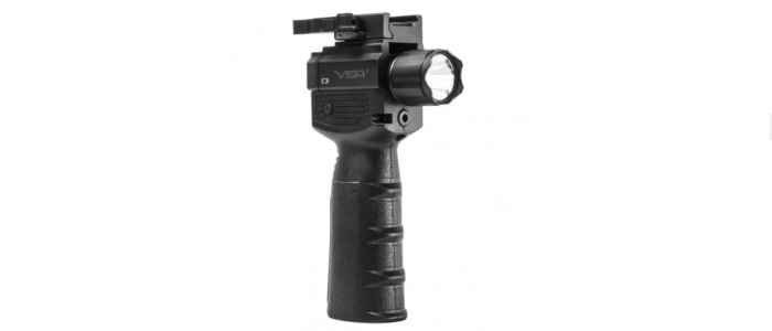 This Vertical Grip with Strobe Light and Green Laser does it all, with a laser sight, gun light, strobe function, and storage compartment all in one compact, efficient package. This features fully adjustable windage and elevation settings on the green laser sight and ultra bright 200 lumen CREE LEDs for the flashlight function. This Vertical Grip w/Strobe Flashlight/Green Laser easily mounts to any type bottom rail system with its locking quick-release mount. Strobe function works in both flashlight and laser sight modes.