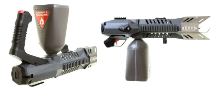 The XM42-X system is powered by a rechargeable lithium-polymer battery (battery and charger included). Simply fill the tank with your fuel of choice, flip the switch cover, and press the trigger button to send a stream of flaming fuel up to 25 feet away.